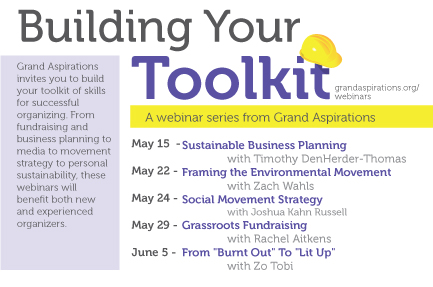 Also, please note that Joshua Kahn Russell’s webinar on Social Movement Strategy has been rescheduled to Thursday, May 24 at 8 pm EST/7 pm CST/5 pm PST. Register now at www.grandaspirations.org/webinars.