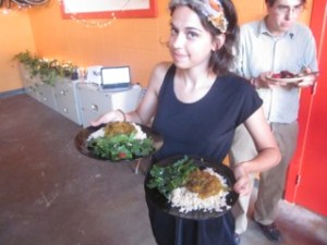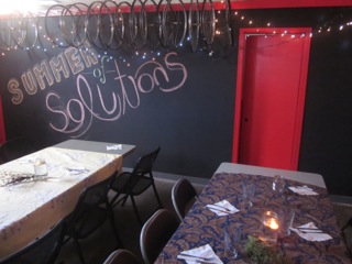 We were fortunate to receive donations of beer from Surly Brewing Company and appetizers from Common Roots Cafe. Many more of our donations came from our friends — tomatoes, beets, and greens from board member Lynn’s garden, kale from program leader Courtney’s farm, basil from Matt’s house, plus the spare flour, oil, spices, and other miscellany that the SoSers who prepared the food provided from our own kitchens. That’s not to mention the dozens of plates, glasses, twinkle lights, table clothes, and other items that people entrusted to us for the night. Some friends living nearby humored my strange request to use their kitchen for the evening. The meal was prepared and received with love and purpose.