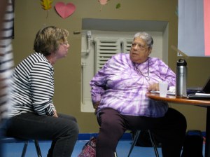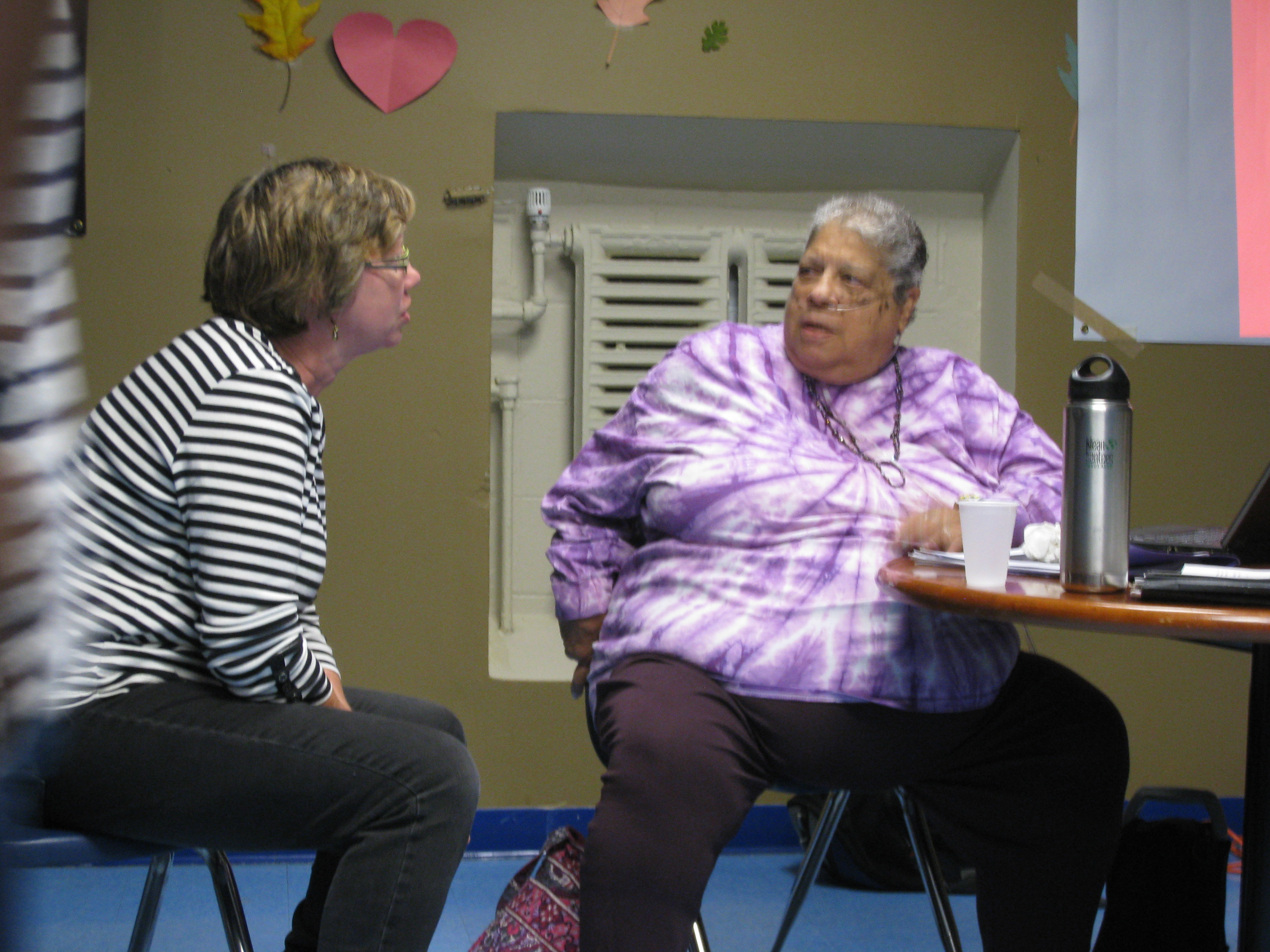 Jane Shay of Homegrown Minneapolis (l) and Annie Young of Harrison Neighborhood Association (r) talk before Annie’s presentation.