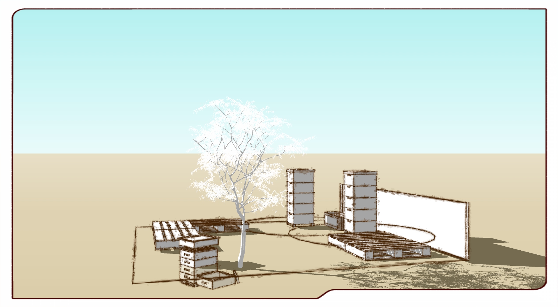 Our time is already ticking and we have initiated conversations with Sofia’s botanical garden and a couple puppet theaters whose roofs would be an ideal home for the bee corner. To help them imagine what this could look like, we’ve sketched it up– pre-flowers and color 🙂